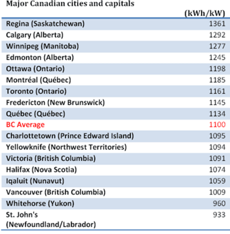 According to the chart above, kwh/kw per year for Toronto is 1161kwh/kw per year. Multiply that by 30 year life of an average solar panel and you have 30year * 1161kwh/kw/year=34800kwh/kw