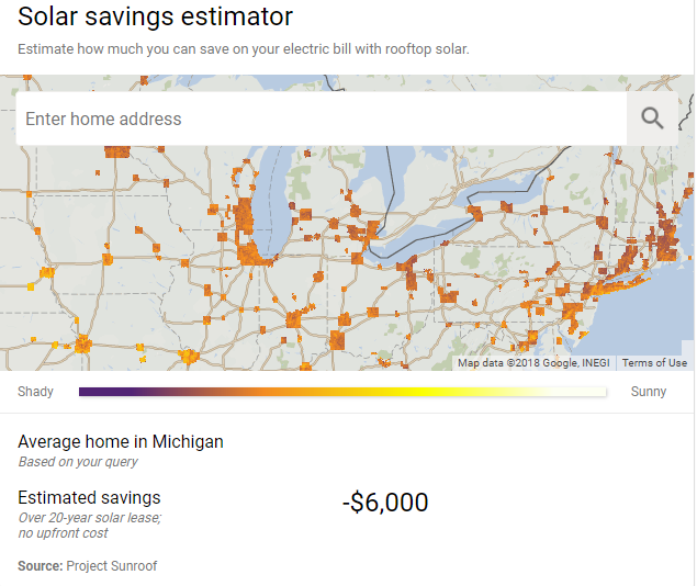 I always thought that solar power in Michigan did not make sense. We have a long winter and lots of snow. If you do a quick google search, they will give you a yearly electric saving of -$6000.