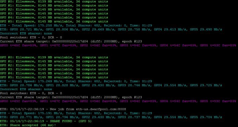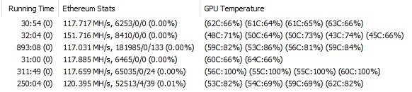 - Snapshot of the Claymore Dual Miner status. Watch for rejected shares, if that number is higher than 0.1% over a longer period, such as days, should consider being less aggressive with the VRAM frequencies.