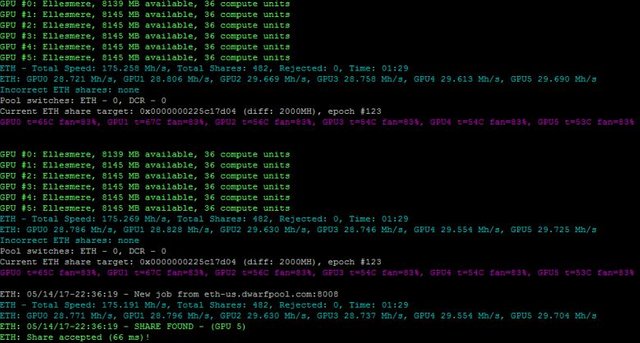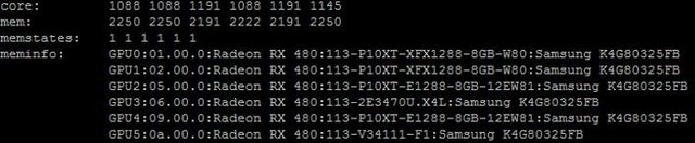 - Here is a snapshot of one of my rigs running 6 GPUs. You could see the running core and mem frequencies as well as the type of GPU. I kept the core frequencies low to be more power efficient.
