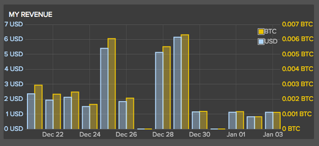 In the table below you can see the drop in daily earnings after December 29th. Luckily the two previous days were very good in terms of my mining pool discovering new blocks: