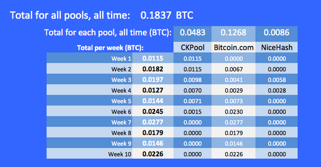 Table 2: my weekly earnings since the start of the experiment, disaggregated by mining pools