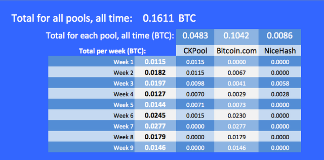 Here comes the numbers. If this past week seems a little too shabby, that’s because: a) it only account for 5 days of the week, not the full seven; b) today my mining pool, Bitcoin.com, failed to find any blocks, which is a little unusual (it usually finds 3–5 blocks per day on average). Please consider these two circumstances, when looking at the numbers below.