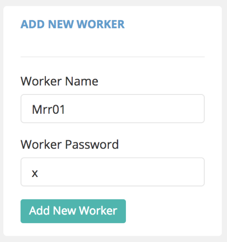 Give it a unique name for example. Mrr01 for password put in ‘x’ and click add new worker. On the right you can see your new worker, to log in using the full name (accountname.workername).
