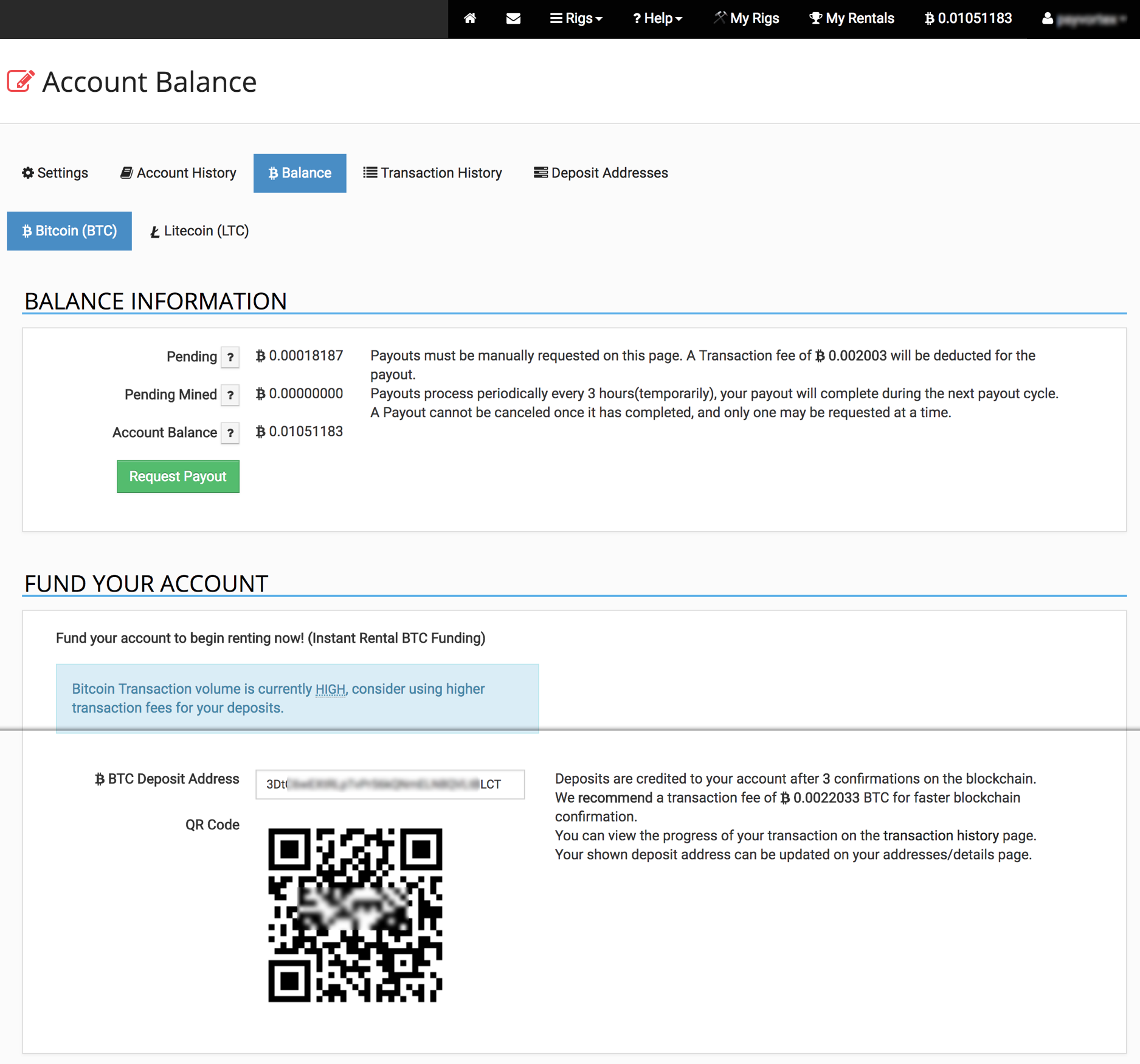 Deposit BTC - Go to Balance – Top Right on the Menu Bar – At the bottom you can see your BTC deposit address. Send some BTC here to rent your first rig! you can start with a small amount. I only dropped in 0.01 BTC the first time I got started at MRR.