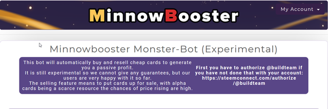 In case you didn't know, on MinnowBooster there's a bot that allows you to automatically trade Steem Monsters cards. It's very easy to set up and will automatically buy and sell cards for a profit. You can use it to buy cards for any amount of Steem and then sell them at a higher markup.