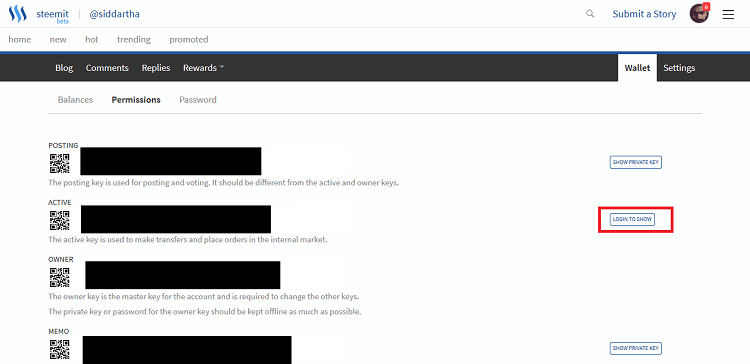 - During the registration time, you may be asked to provide your Active Private Key. To get that, go to, Wallet>>Permissions>>Active. You will have to press the login to show button, enter your steemit password and then click show private key next to your active key.