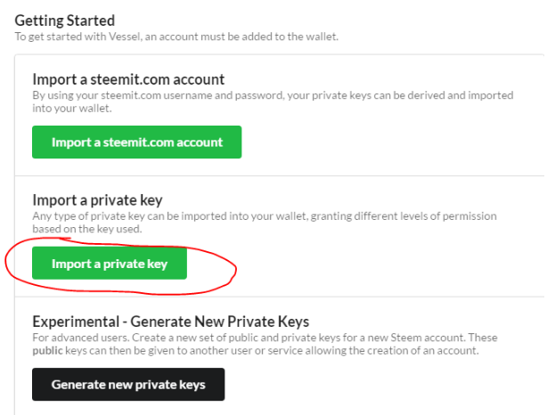 When you launch Vessel for the first time you will be greeted with this screen below. We will use the Active Private Key for this example, so please click the "Import a private key".