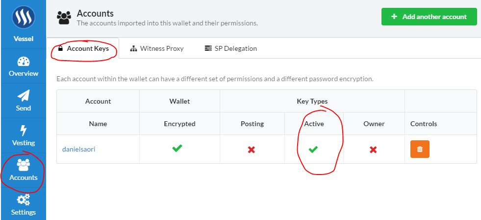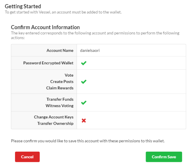 To be able to use Vessel you will need your Active Private Key. You will see later that you can decide which permissions to grant to Vessel. The minimum you need for SP Delegation is the active private key.