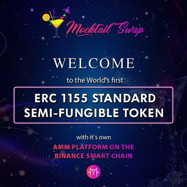 Mocktail is the world's first ERC 1155 standard Semi-Fungible Token (SFT) on Binance Smart Chain. ERC-1155 is a digital token standard created by Enjin that can be used to create both fungible (currencies) and non-fungible (digital cards, pets, and in-game skins) assets on the Ethereum Network. By using the Ethereum network, ERC-1155 tokens are secure, tradable, and immune to hacking. ERC-1155 a new way of creating tokens that allow for more efficient trades and bundling of transactions – thus saving costs. This token standard allows for the creation of both utility tokens (such as $BNB or $BAT) and also Non-Fungible Tokens.