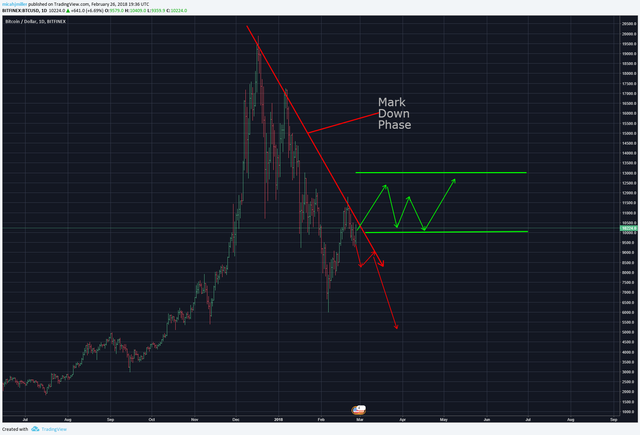 Bitcoin is currently in a mark down phase, clearly. It must successfully break into a positive upward trend for it to be in a stage appropriate for accumulation.