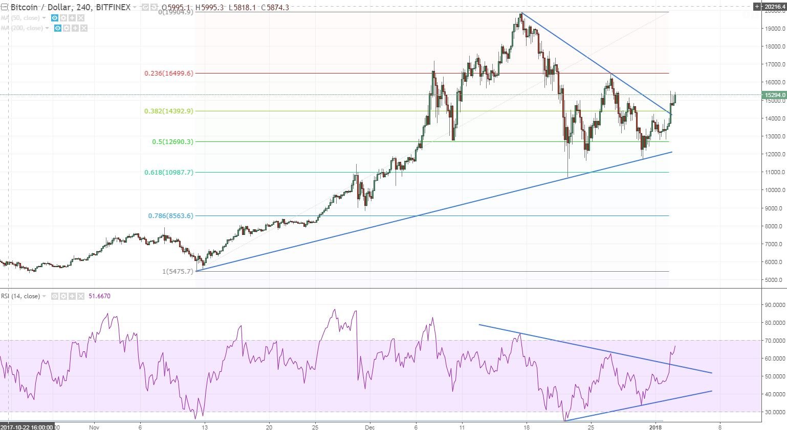 Meanwhile, Bitcoin, that has been in a boring lull for quite while, managed to break out of it's consolidation triangle yesterday. If you add the double bottom (not counting the spikes), this could be forming a bullish W pattern. The year is young but the game remains the same - load on dips - big players haven't had their chance for some big rallies yet.