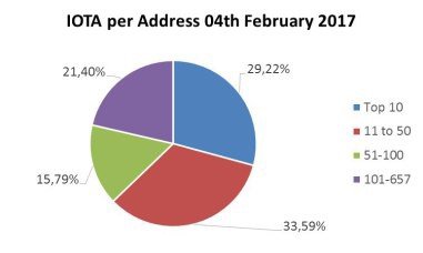 On November 27th around 48% of all Iota was claimed by their owners. Until the 4th of February, additional 12% of Iota was claimed for a total of 60%. The number of addresses with a positive balance increased from 472 to 657 (+39%) and the number of addresses with more than 1 Gi increased from 334 to 494 (+48%). The time to claim IOTA ran out before the recent snapshot so that now all tokens are issued — with all unclaimed tokens now being in the sphere of the developers. It is not known how much remained unclaimed, but a good guess could be to add the top two addresses, which are known to belong to the foundation/the devs. This would be 406,834Gi or around 14.6% of total supply.
