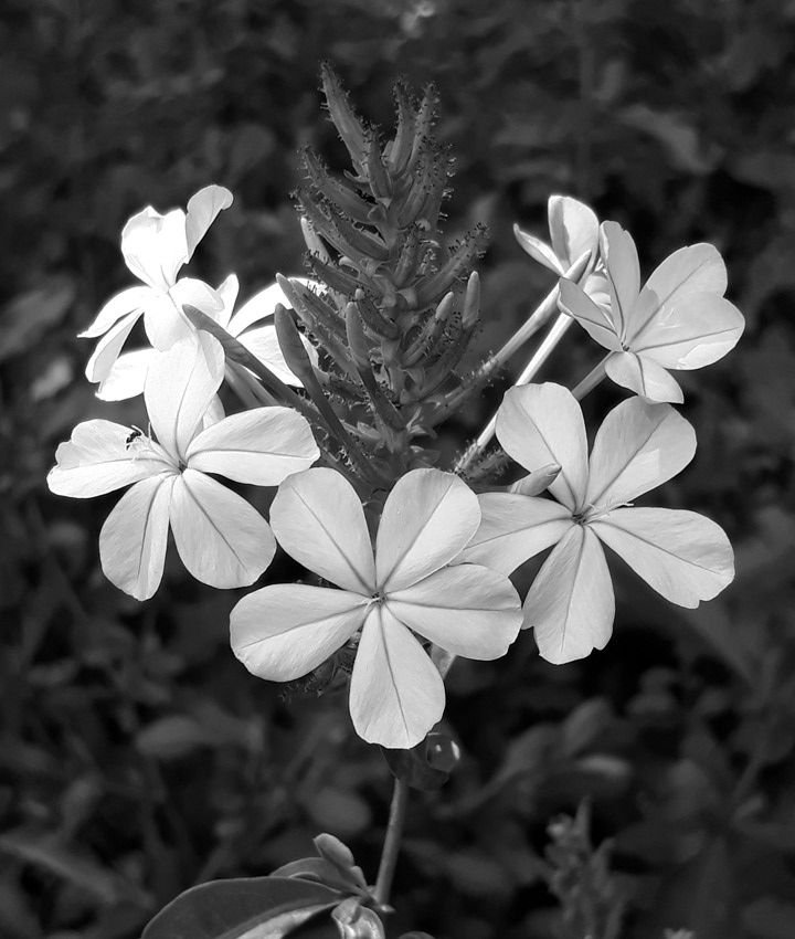 Plumbagos are one of my favorite flowers. I love the macro black and white. At first I was thinking it was a frangipani until seeing the top fringe.