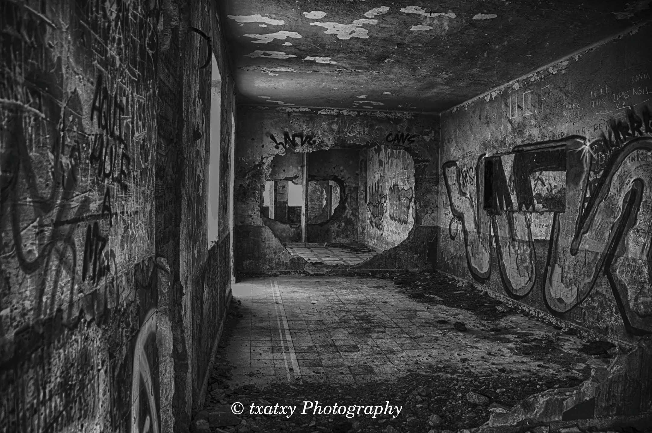 Wow!! This is spectacular with the graffiti-strewn walls and the dark foreboding interior. Love. Super love this entry.
