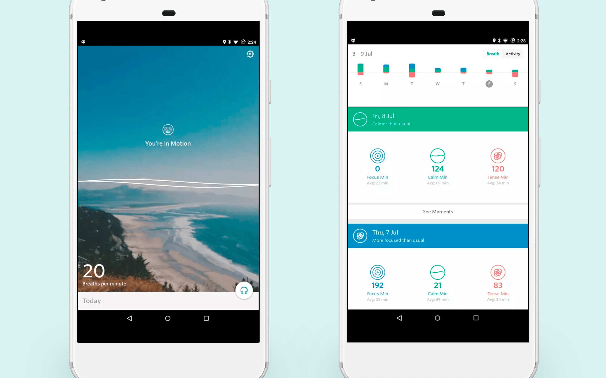 This mood tracker app is connected to a wearable device which monitors when people feel stress and have increased heart rate and heavy breathing. In such cases, it informs a user that he or she needs to relax. The app notifies users if they need to distract and if they don't breathe deeply enough. It also tracks users activity, counts steps and if they sit for too long. As well as that the app offers a range of meditation scenarios to relax during a day.