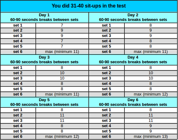 In the short time, you will add next training plans to your routine: push-ups, squats, pull-ups, running. I will provide all the training plans in the future articles, in this current one I will present the plan for sit-ups.