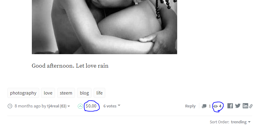 check the blue highlights, even though I earned nothing on the post I was actually happy because 4 people had view it, that was the days when I had no one to talk to, no one to show me what to do not to talk of supporting