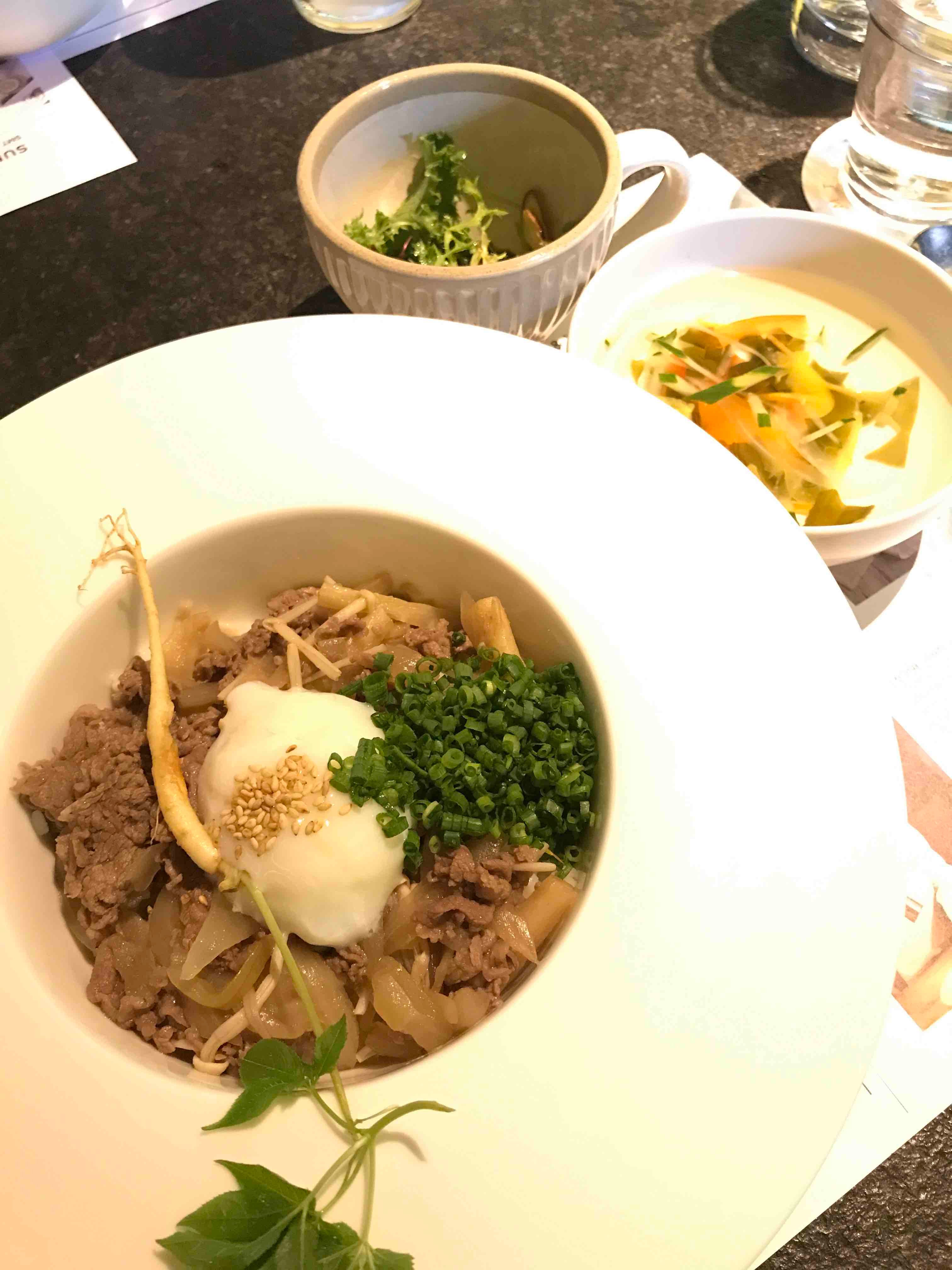 뿌리 채소를 베이스로 한 불고기덮밥입니다. 무더운 여름 에너지가 나는 한끼라는 컨셉으로 마스터 쉐프 님께서 준비하셨다네요. 위에 살포시 올라가 있는 인삼 한뿌리가 인상적입니다. ㅎㅎ