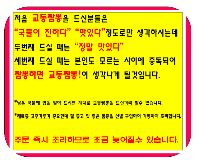 '남은 국물에 밥을 말아 드시면 제대로 교동짬뽕을 드신거라 할수 있습니다.'