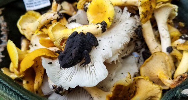 A little toad hitched a ride in my mushroom basket full of chantrelles and oysters.