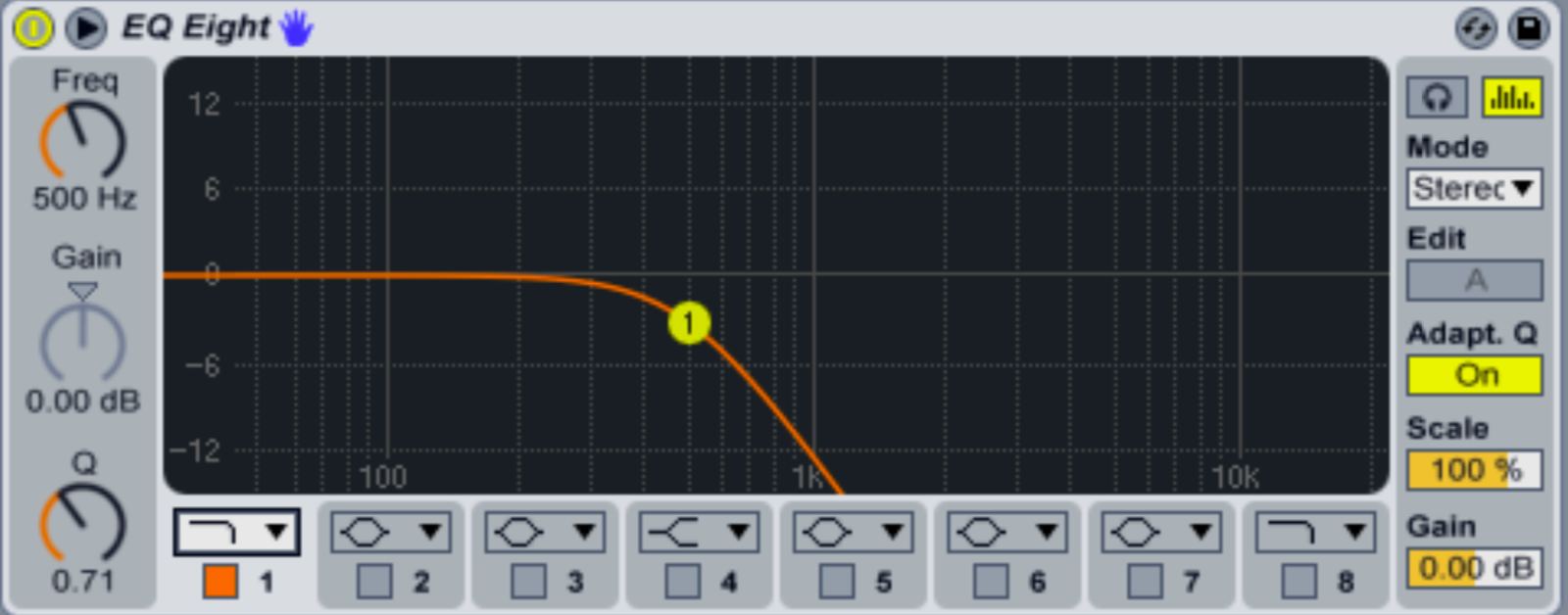 Live’s EQ8 tool is a Parametric Equalizer. A parametric equalizer can control three aspects of each frequency: level (boost or cut), the center or primary frequency, and the bandwidth or range of each frequency. Parametric equalizers are used in digital audio workstations because they have much more control over the sound. Live’s EQ8 has the following functions: