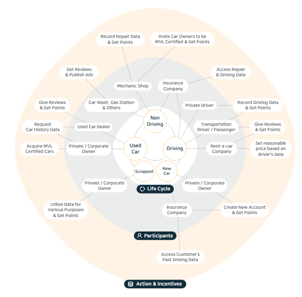 MVL Ecosystem will tackle these problems down by applying the blockchain technology. With this, we can track a vehicle’s lifetime activities and continuously collect data safe from distortion. Only the owner will have the authority over his or her data stored on the decentralized blockchain. In the past, a limited number of centralized services monopolized data, but now the power of who owns the information is distributed evenly to the people. Various participants in the vehicle market can continue to add trustworthy data and be connected in one ecosystem.