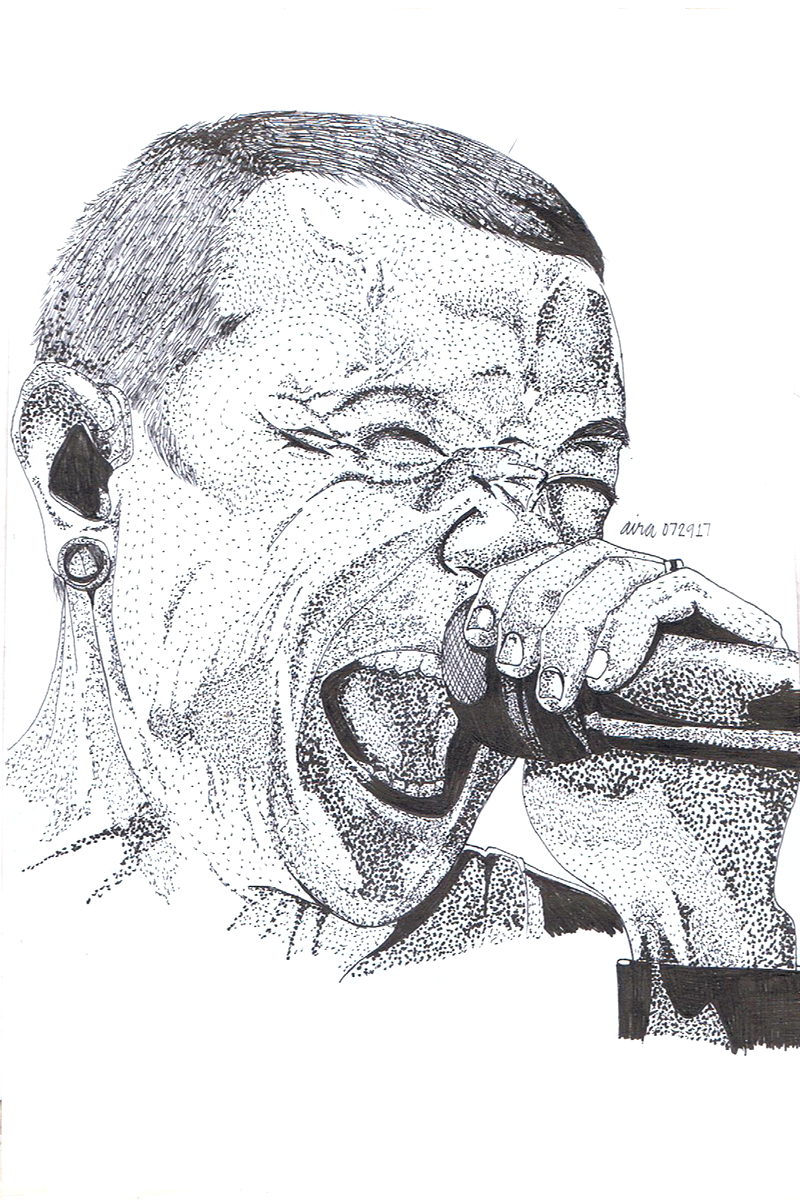 I was so heartbroken after hearing of Chester's death. I had always been a huge Linkin Park fan, and his death took a huge chunk in my heart. As tribute, I drew Chester in pen, with a method that I found particularly agonizing, but definitely worth it: stippling.