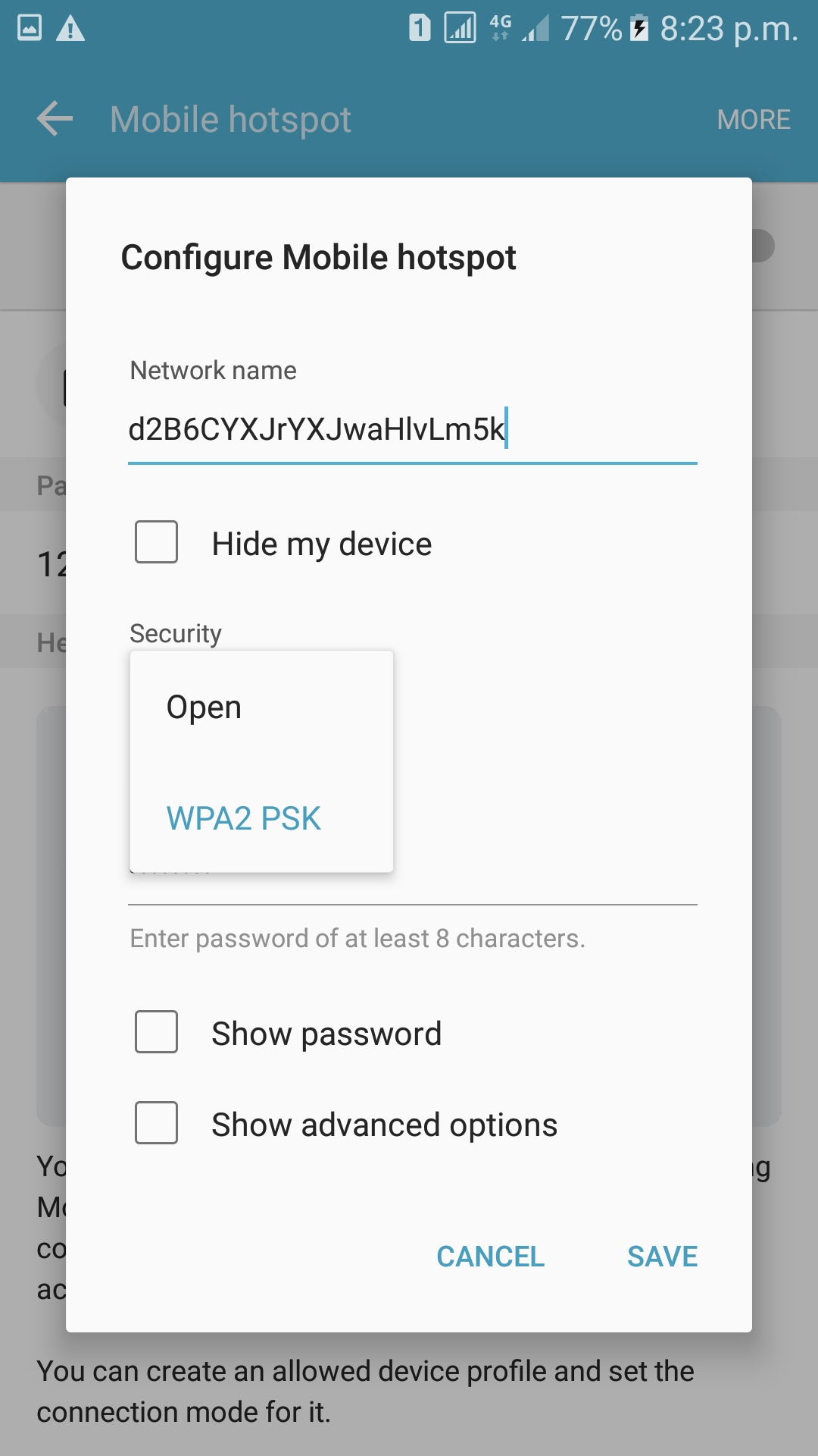 Security တြင္ေတာ့ စကား၀ွက္ထား၍ရႏိုင္သလို စကား၀ွက္္မထားဘဲ ဖြင့္ထား၍လည္းရပါသည္။ မိမိထုတ္လႊတ္မႈကို ေတြ႕ရွိေသာ္လည္း စကား၀ွက္သိမွသာ ခ်ိတ္ဆက္၍ ရေစလိုပါက WAP2/PSK ကိုေရြးကာ ေအာက္အကြက္တြင္ ထားခ်င္ေသာ စကား၀ွက္ကိုရိုက္ႏွိပ္ကာထားႏိုင္ပါသည္။ စကား၀ွက္မထားလိုပါက Open သာထားလိုက္ပါ..အားလံုးစိတ္ႀကိဳက္ ျပင္ဆင္္ၿပီးေသာအခါ Save ကိုႏွိပ္၍ မိမိျပင္ဆင္လုိက္ေသာ Setting မ်ားကို သိမ္းဆည္းႏိုင္ပါသည္။ Show Password ကေတာ့ မိမိရိုက္ႏွိပ္လိုက္ေသာ Password မ်ားကို ရိုက္ႏွိပ္စဥ္ စကၠန္႔အတြင္းျမင္ေတြ႕ရမည္ျဖစ္ၿပီး Advanced Option ကေတာ့ ထုတ္္လႊတ္မႈ Channel နံပါတ္ကို သတ္မွတ္ႏိုင္ပါတယ္... ဒါကေတာ့ သံုးစရာမလုိပါဘူး..