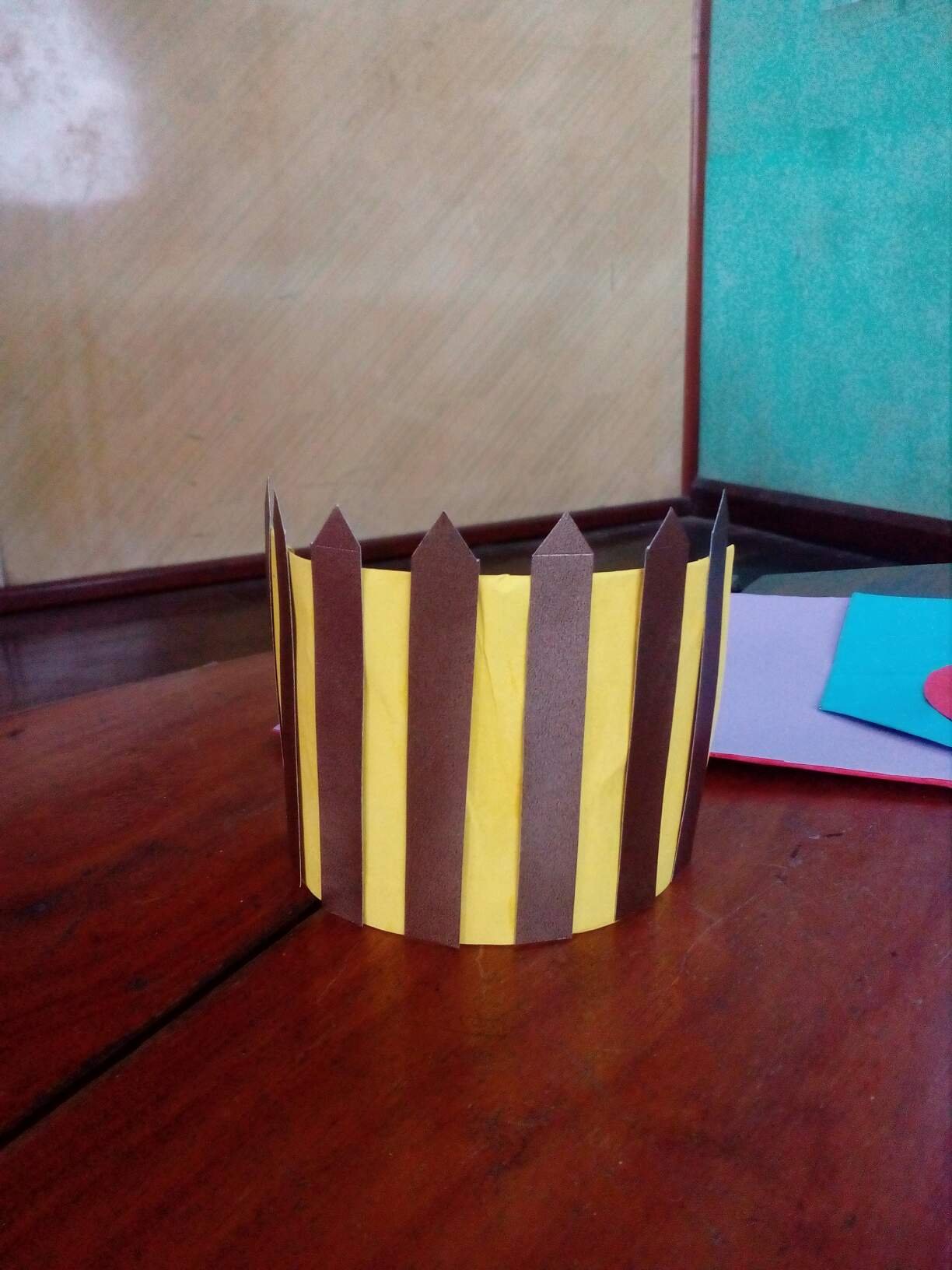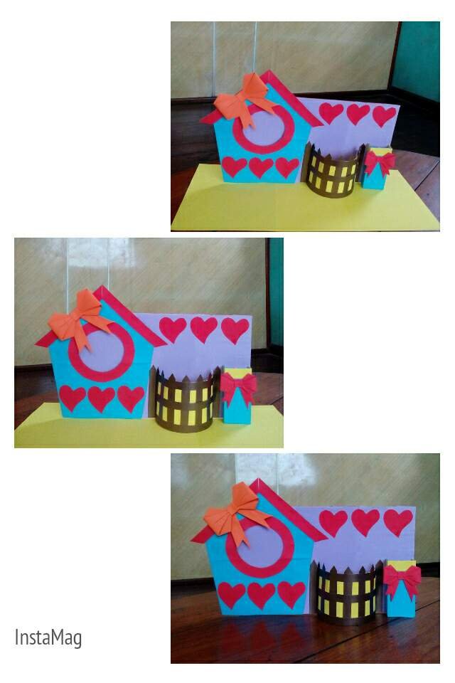 ပထမအဆင့္မွာအိမ္ပံုစံကတ္ထူတစ္ခုျဖတ္မယ္။အလယ္မွာပံုထည့္လို႔ရေအာင္စက္၀ိုင္းပံုဆြဲ၍ျဖတ္လိုက္ပါတယ္။အိမ္ပံုစံကိုေတာ့အျပာေရာင္စာရြက္ေကာ္ကပ္ၿပီး၊စက္၀ိုင္းပံုမွာေတာ့အနီေရာင္ေဘာင္အျဖစ္အနားကြပ္ေကာ္ကပ္လိုက္ပါတယ္။အိမ္ရဲ႕အမိုးအျဖစ္ကတ္ထူႏွင့္အနီေရာင္စာရြက္ျဖင့္ပံုေဖာ္လိုက္ပါတယ္။ဆက္လက္ၿပီးအ၀ိုင္းပံုစံပလတ္စတစ္ဘူးဒါမွမဟုတ္ကတ္ထူဘူးတစ္ခုကိုယူ၍တစ္၀က္ျဖတ္လိုက္ပါတယ္။အ၀ါေရာင္စာရြက္ေကာ္ကပ္ၿပီး၊အညိဳေရာင္ကတ္ထူကိုျခံစည္း႐ိုးပံုစံလိုပံုေဖာ္ခ်င္တာေၾကာင့္ပံုပါအတိုင္းျဖတ္ၿပီး၊ပံုေဖာ္လိုက္ပါတယ္။ေနာက္တစ္ခုကိုလည္းကတ္ထူဘူးခြံအေသးတစ္ခုယူ၍တစ္၀က္ျဖတ္ကာေရာင္စံုစာရြက္ျဖင့္ေကာ္ကပ္လိုက္ပါတယ္။ၿပီးေနာက္ျပဳလုပ္ၿပီးတဲ့သံုးခုကိုအျခားကတ္ထူတစ္ရြက္ေပၚပံုပါအတိုင္းေကာ္ကပ္၍ဆက္လိုက္ပါတယ္။ဒီကတ္ထူကိုေတာ့ခရမ္းေရာင္ေလးျပဳလုပ္လိုက္ပါတယ္။