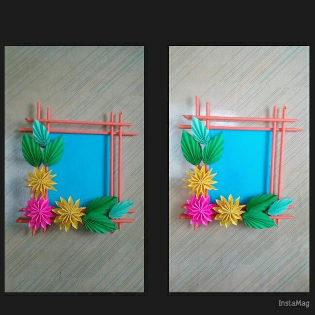 ျပဳလုပ္ၿပီးတဲ့အရြက္ႏွင့္ပန္းပြင့္ေတြကိုနေဘးေဘာင္ေပၚမွာပံုပါအတိုင္းေကာ္ကပ္အလွဆင္ထားပါတယ္။နံရံကပ္ဓာတ္ပံုေဘာင္ျဖစ္ၿပီး၊အျပာေရာင္ကတ္ထူမွာပံုေလးေတြကပ္ႏိုင္ပါတယ္။