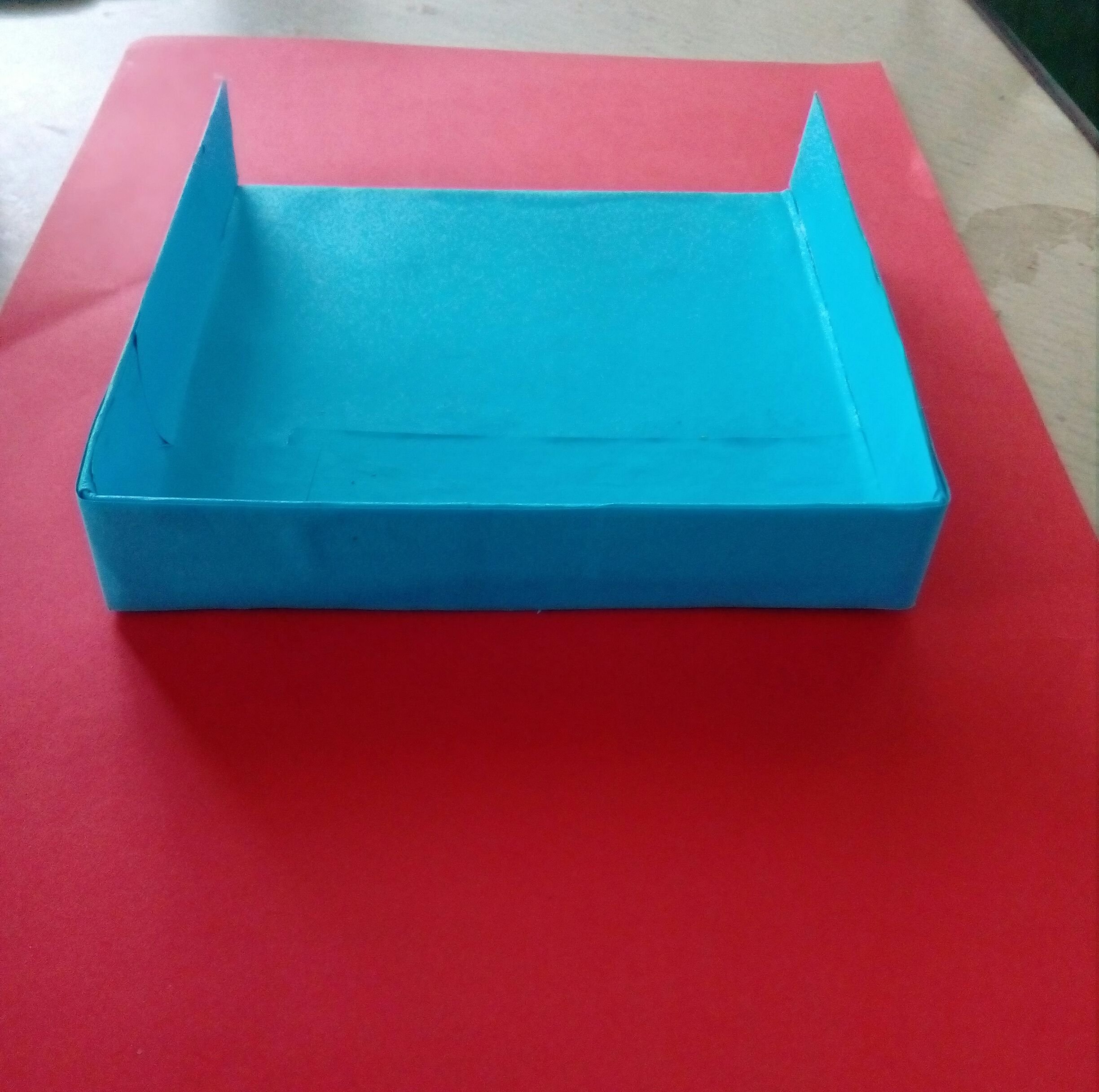 ဒီလိုမ်ိဳးကတ္ထူစကၠဴမ်ားကိုေကာ္ကပ္ၿပီးရင္ေတာ့၊အတြင္းဘက္အတြက္အျပာေရာင္စာရြက္ႏွင့္ထပ္မံကပ္ကာ၊အျပင္ဘက္အတြက္ကိုပန္းစာရြက္ကိုထားလိုက္မွာပါ။အားလံုးေကာ္ကပ္ၿပီးတဲ့အခါမွာေတာ့ကတ္ထူကိုေခါက္ခ်ိဳးလိုက္ရင္ပံုမွာျမင္ရတဲ့အတိုင္းေခါက္လို႔ရတဲ့ပံုစံျဖစ္လာမွာပါ။ၿပီးေတာ့ခုနကျပဳလုပ္ထားတဲ့ကတ္ထူဘူးခြံကိုအလယ္မွာညီညာစြာထားၿပီးေကာ္ကပ္လိုက္မယ္။