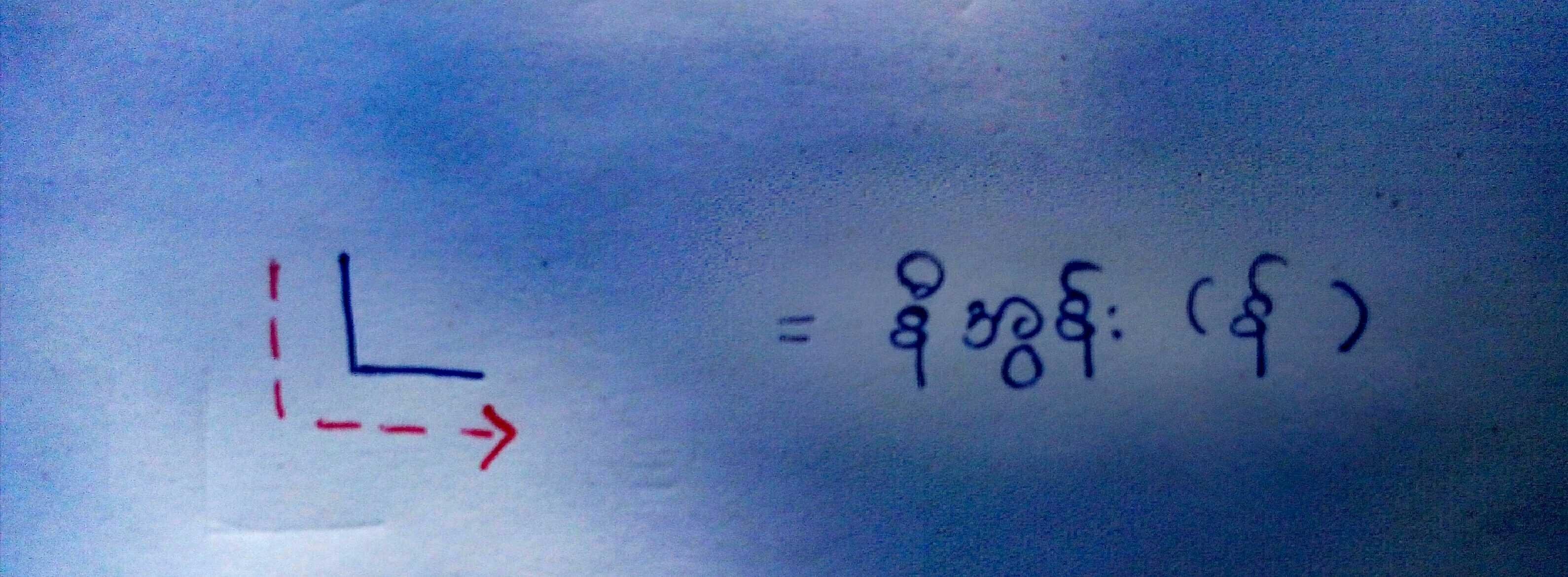 ေဘာပင္အျပာျဖင့္ စာလံုးပံုစံကို ေရးျပထားၿပီး မင္အနီေရာင္ျဖင့္ ေရးပံုေရးဆြဲနည္းကို ေဖာ္ျပထားသည္။