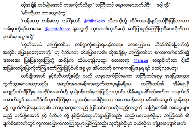 ရယ္ ရတာ အူေတာင္ နာတယ္ ေတာ္ေသးတယ္ ကြ်န္ေတာ္ က်န္ခဲ့လို့ မပါတာ ေက်းဇူးတင္ပါတယ္ tinmyoaung က ပ်ိ ဳတိုင္းႀကိ ုက္တဲ့ ႏွင္းဆီးခိုင္ ႀကီးဆိုေတာ့ လက္ဖက္ရည္ေတာ့ တိုက္ခိုင္းရမယ္ ဆက္ရန္ ဆိုတဲ့ post ထက္တင္ရင္ ကြ်န္ေတာ့္ ကို ေမ့ထားေနာ္