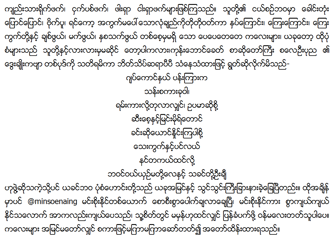 ရန္းႀငိဳက္ စြန္းေကာင္း ေနာက္ဆံုးက ခိုးခ်ထားပါတယ္ ဆိုတဲ႔ သေရာ္လံုးေလးဆို အရန္းထိ မိုက္တယ္ဗ်ာ