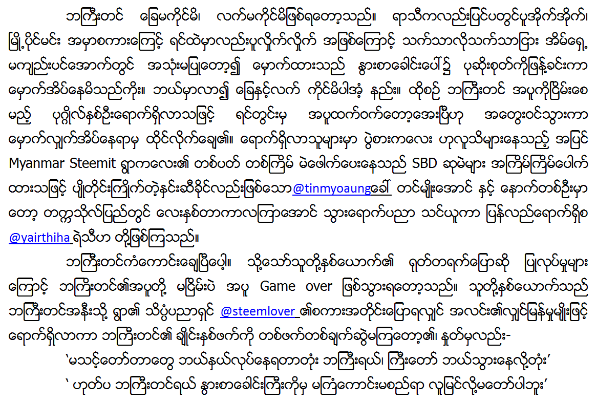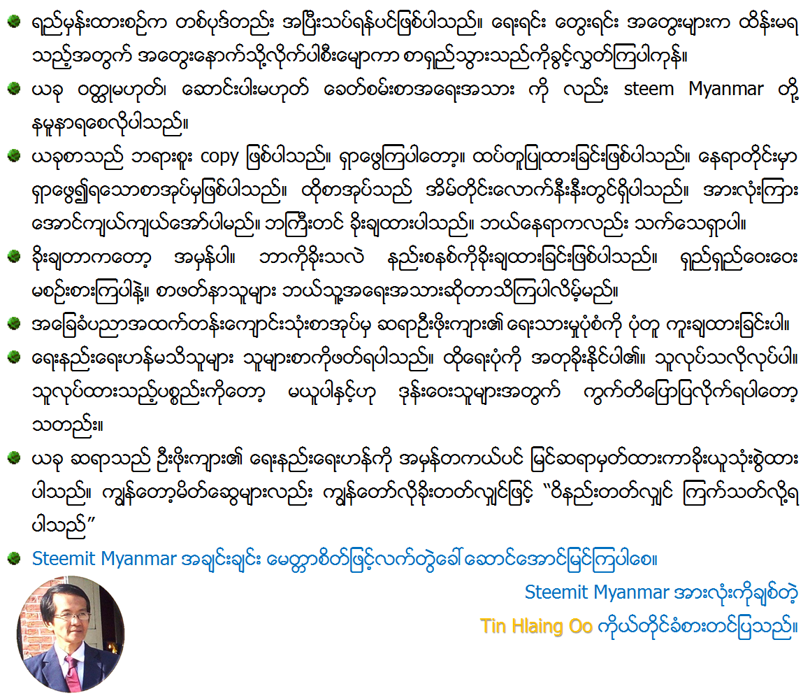 ၿမဳိ႕ပုိင္မင္း ႏွင့္ Myanmar Steemit ရြာသားမ်ား အပုိင္း(၁) (Tin Hlaing Oo)tinhlaingoo (61)in #myanmar • 8 years ago (edited) Writing @tinhlaingoo #steemit #culture
