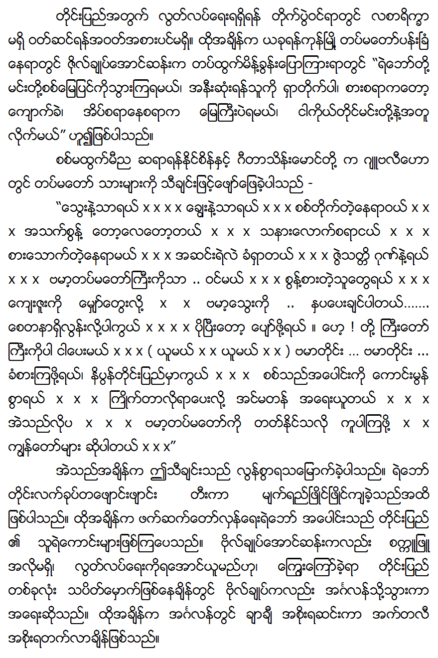 စာေရးတယ္ဆုိတာ လက္ကစာလုံးထင္ေအာင္အေထာက္အပံ့ေပးရုံတင္ပါ။ တကယ္ေရးရတာ စိတ္ကေရးရတာမုိ႔ စိတ္ထဲမွာ ရွင္းလင္းမႈမရွိရင္ေရးလုိ႔မရပါဘူးဗ်ာ။