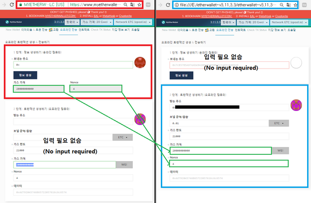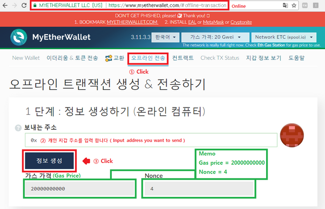 먼저 Online 컴퓨터에서 https://www.myetherwallet.com 을 연결한다음, [오프라인 전송(Send offline)] 메뉴를 선택합니다. 그리고 출금 하고자 하는 주소를 입력한후 [정보생성(Generate Information)] 을 실행하면 아래처럼 가스가격(Gas Price), Nonce 값을 보실 수 있습니다. 이 값은 기억 또는 메모를 해 두십시오.