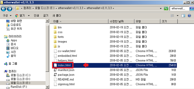 Offline 컴퓨터에 다운받은 etherwallet-v3.11.3.3 을 복사 (USB 를 이용)후 압축을 해제 합니다.
