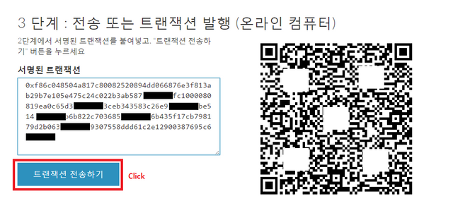 STEP 4 에서 복사한 서명된 트랙잭션 정보를 Online 컴퓨터에서 아래 처럼 복사한후 [트랜잭션 전송하기(send transaction)] 버튼 클릭