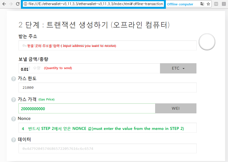 받을 주소(To Address), 보낼 수량(Amount to Send ),가스 가격(Gas Price), Nonce 값을 입력합니다. (Do it offline 컴퓨터) Nonce 값은 STEP 2에서 얻은 Nonce 값을 입력해야 됩니다. 가스 가격 참고는 Https://ethgasstation.info/index.php