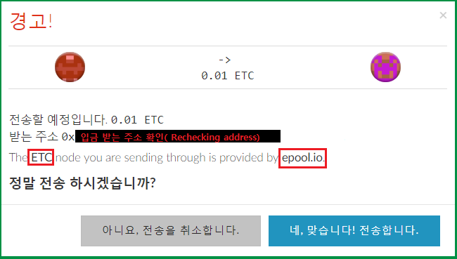 확인 메세지 창이 열리면 입금받는 주소를 확인 후 전송합니다.(Confirm message )