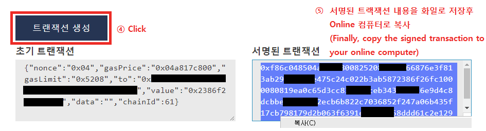 [트랙잭션 생성(Generate transaction)] 실행후 아래 그림의 서명된 트랙잭션(signed transaction) 내용을 전부 복사하여 별도의 화일로 만든다음 USB 를 이용하여 Online 컴퓨터로 복사합니다.(Proceed in order ④ ⑤ )