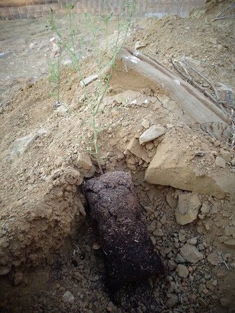 So I started to dig some holes big enough for the tree saplings. As you can see the “soil”, but the Algarrobo tree loves it!