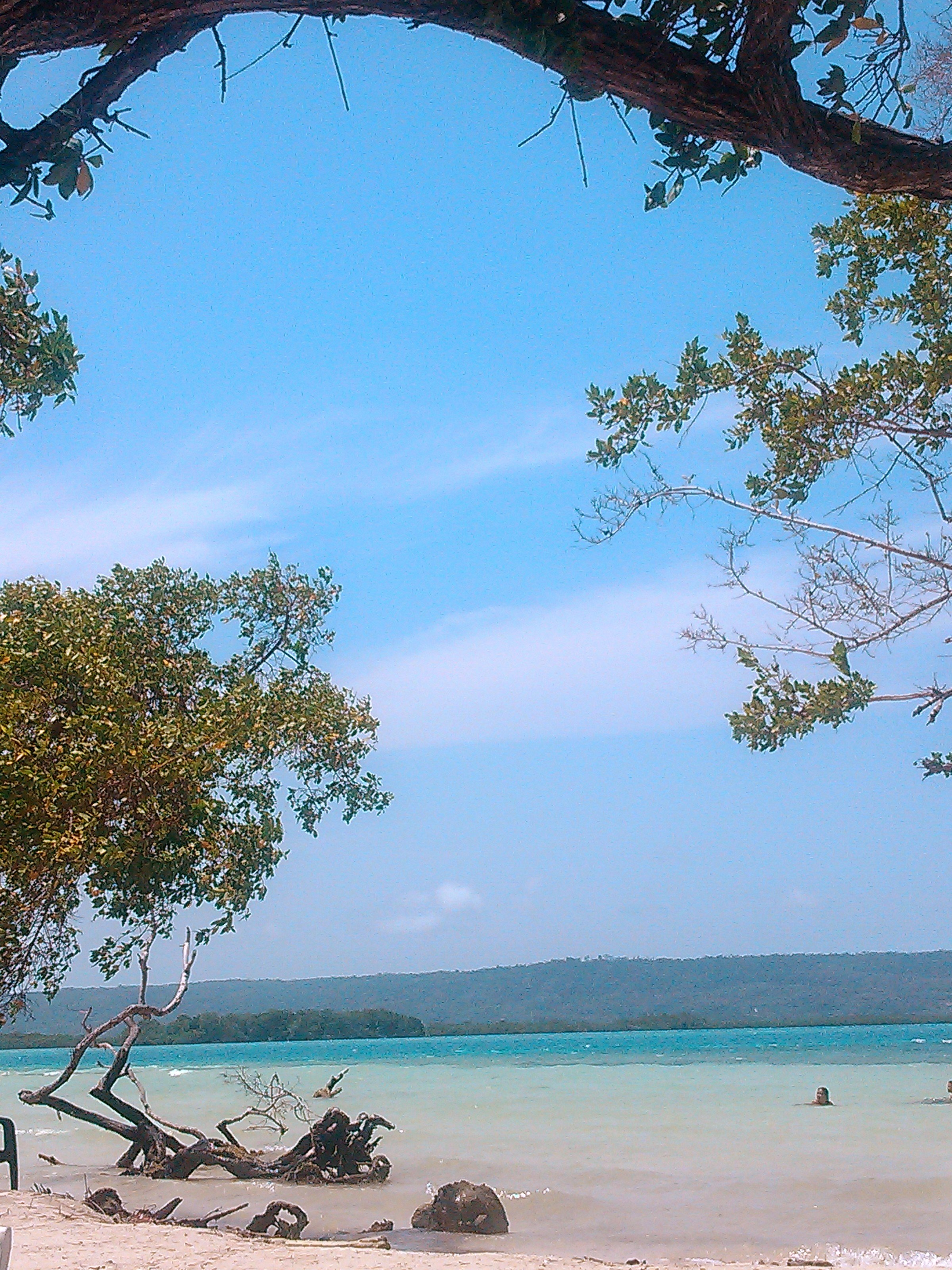 It's a nice day to be at the beach. And that looks like a good one. From the color of the water, it looks like you can walk out pretty far. And it's calm. No waves. Is it always like that? Nice and protected.