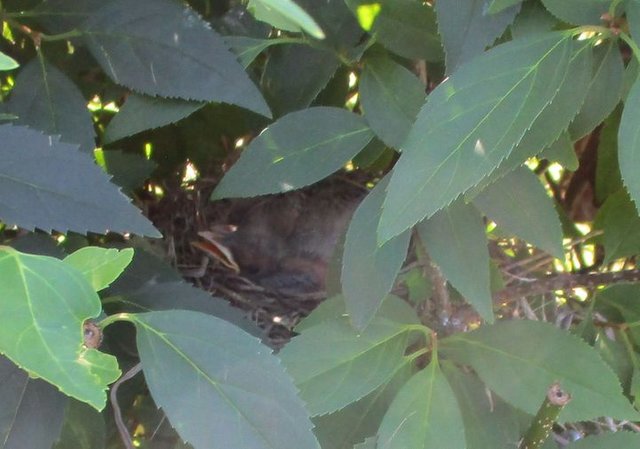 Cute robins. One built a nest right next to the laundry room at eye level in my old apartment. The mother got used to us all bringing in our laundry. The whole apartment complex got to see the little baby growing up and finally leave the nest. We dubbed it eggbert.