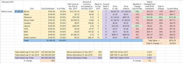 Another one of the underlying questions for the experiment is: considering how much growth there was in 2017, are cryptos still good place to put your money in 2018 compared to other investments? To have something common to compare the cryptosphere to, I will also be tracking the S&P 500. The stock market had a pretty rough February as well and the S&P is down quite a bit for the month. And since the beginning of the year, January the S&P 500 has only seen a 1% increase.
