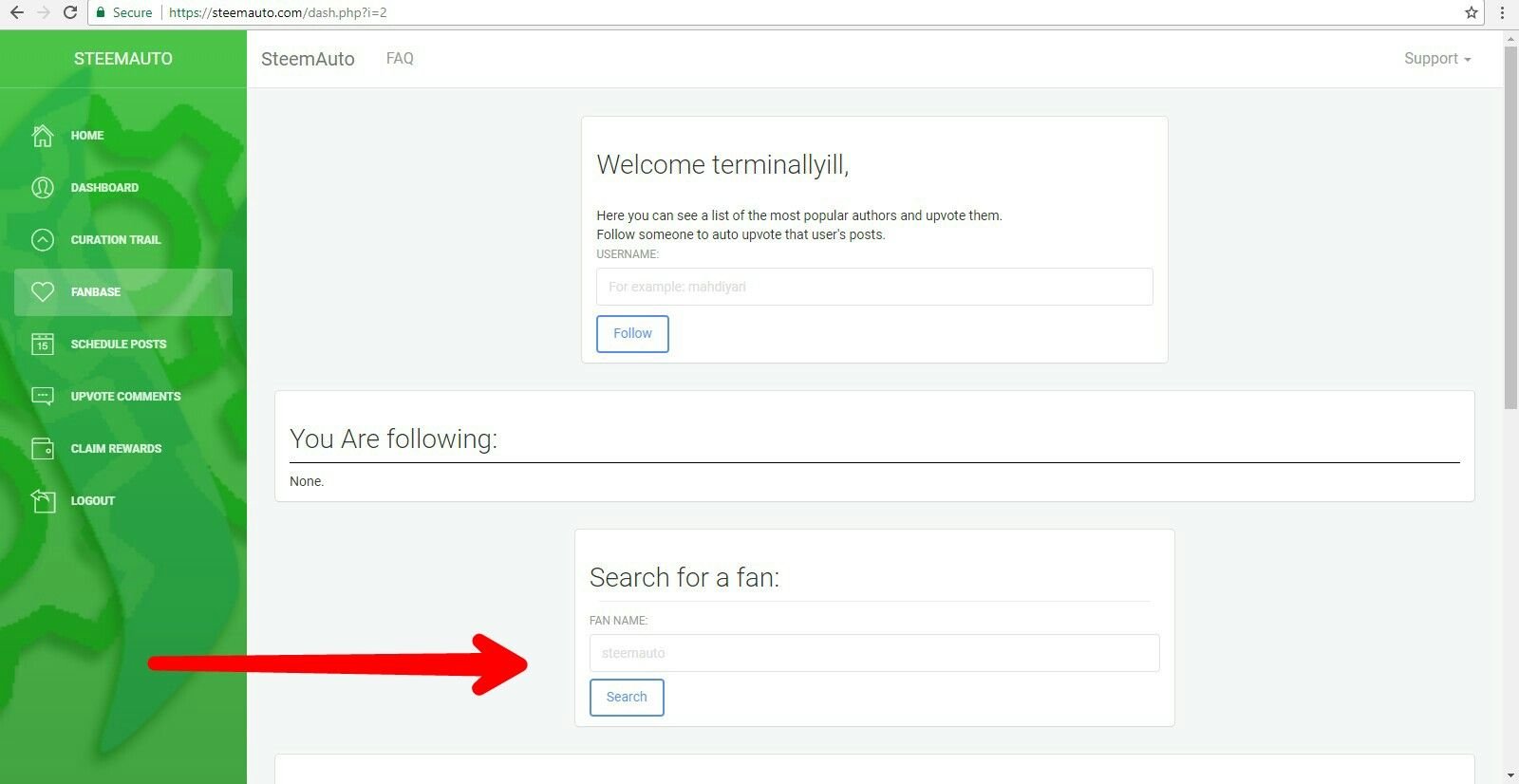 By using the window seen above in the photographs, a user can search for another Steemit user and add their account to their follow list, making the user a "fan" of the author and adding to their "fanbase". This will cause a user's Steemit account to automatically upvote every single post that the author publishes, making supporting your favorite Steemians no longer s hit or miss task. Fanbase automatically upvotes these posts, leaving you the free time to move on to other important tasks.