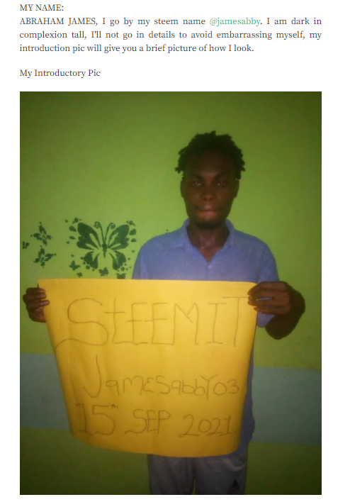 ABRAHAM JAMES, I go by my steem name @jamesabby. I am dark in complexion tall, I'll not go in details to avoid embarrassing myself, my introduction pic will give you a brief picture of how I look.