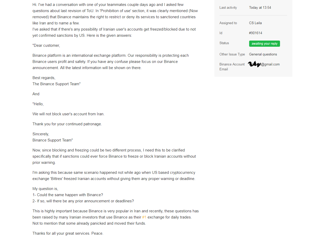 - As you have seen, this time in the text of the question, it was explicitly referred to the concerns of Iranian users, including the incident that occurred in the context of the Bittrex. And if you care, the answers are received from three different supporters. It can be said that the final response from the support of the Binance can in many respects provide the comfort of the Iranian users..